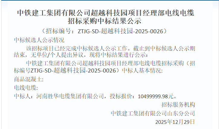 2026伊始,河南勝華電纜集團有限公司傳來中標喜訊。在中鐵建工集團有限公司超越科技園項目經理部電線電纜招標采購中標結果公示中顯示,招標編號ZTJG-SD-超越科技園-2025-0026) 電線電纜中標人:河南勝華電纜集團有限公司,投標報價:10499999.98元。 河南勝華電纜集團一直致力于電線電纜的研發、生產和銷售,以高品質的產品和良好的服務贏得了廣泛的市場認可。此次中標,是對其一直以來堅持走品質之路的證明,后續將堅持以質量求生存、以創新求發展的經營理念,為客戶提供好的電纜產品和服務。